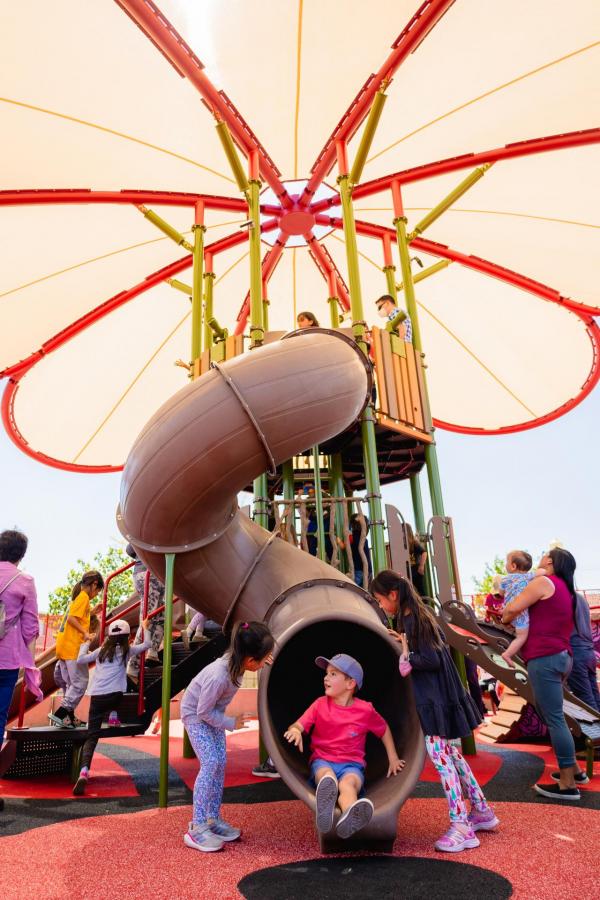 But city officials didn’t forget. An updated version, compliant with current safety standards, is now one of the centerpieces of a new park that opened earlier this year. The result is a vibrant space with lively colors, ample seating, and equipment for toddlers.