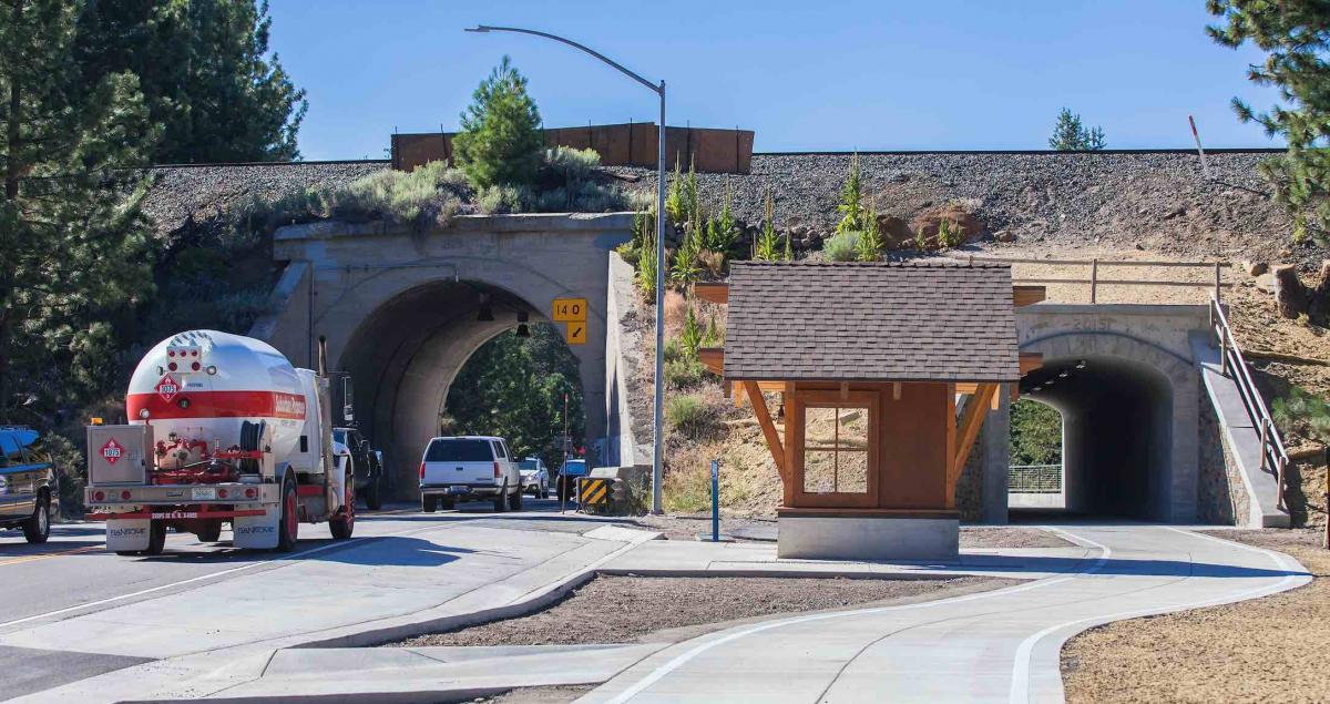 The Town of Truckee had a growing problem in the years leading up to 2016. Pedestrians and bicyclists traveling along State Route (SR) 89, the most heavily used highway between Interstate 80 and Lake Tahoe, had to share a narrow road crossing under railroad tracks with cars and trucks. The 24-foot-wide concrete tunnel under the Union Pacific Railroad was built in 1928, and it has no shoulders, bike or pedestrian facilities. Each day, up to 20,000 vehicles pass through the tunnel, which local residents call “the Mousehole.”